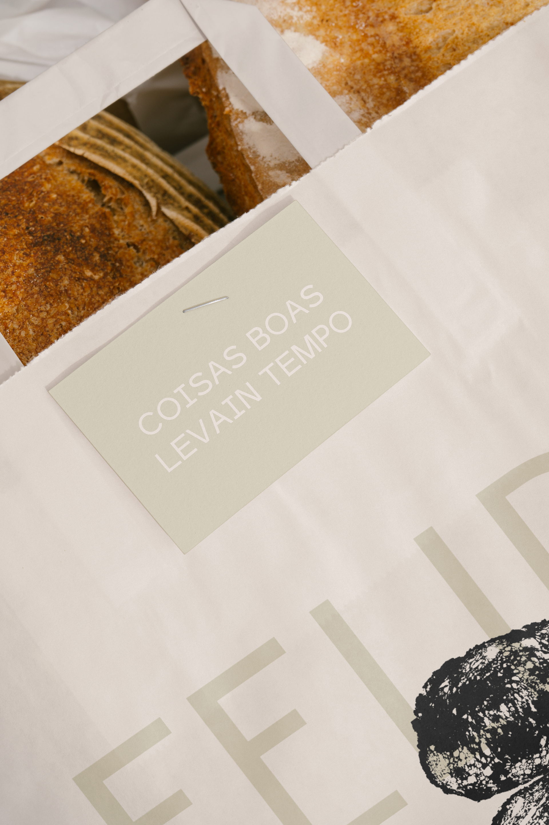 O slogan “Coisas boas levain tempo” expressa o pensamento da marca de forma direta. LEVAIN, cultura viva da fermentação natural, se torna linguagem própria e conecta técnica e significado. Para quem conhece, revela o processo. Para quem não conhece, comunica a importância do tempo no resultado final. A identidade visual segue o mesmo ritmo. As imagens mostram o processo real da padaria, com luz natural e a textura como elemento central. A partir disso, usamos os próprios alvéolos do pão como ferramenta gráfica, carimbando o pão para gerar uma textura original, criada diretamente do processo e não de um recurso externo. O pão, a massa e o espaço constroem uma narrativa simples, onde o produto reflete o caminho percorrido até chegar à mesa.